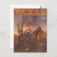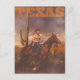 Retro style cowboy advertisement for Texas, the lone star state. Features a colour photo of a young cowboy sitting on a horse in front of cactus and an orange sunset and hills.