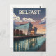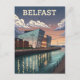 Den här reseaffischen vintage-stil fångar den slående arkitekturen på museet i Titanic Belfast vid vriden. Museets skarpa, vinkelräta fasad reflekteras på ett vackert sätt i hamnens stilla vatten, med en linje av gatubelysning som belyser vattenfronten. Himmel är en blandning av djupa blåsor och varma, glödande moln, och avlägsna berg sluter upp på serenkvällsplatsen. Återkonsten stil gör detta till en perfekt biet för alla som kärlek Belfast, modern arkitektur eller vintage resor konst.