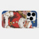 Julillustration Glad jul semesterbokomslagskonst från den klassiska barnboken "Det var natten före jul". Designen visar en glad, jolly jultomte som klättrar ner genom skorstenen på ett hus med en säck full av leksaker på julaftonskvällen. Gula, tindrande stjärnor lyser på den ljusblå himlen.