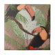 Två livfulla tukaner, som genomborras mitt i den tropiska busken, dominerar scenen. Fåglarna, som är fet svart med påfallande orange och bibbor, förlovad i en mjuk interaktion. Den ena blickar uppåt, dess slag lite öppen medan den andra ser direkt ut utåt och engagerar tittaren. De skapar en dynamisk komposition, något förskjuten,