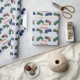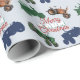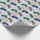 Papper julomslutning med ett jordbrukstema och traktorer mönster. Vintage traktorer omger texten till anpassningsbarna. "God jul på gården" är ett exempel och allt linjer kan ändras. Texten är röd och vit. Traktorerna är grönt, bruna och marinblå. Bakgrunden är lätt grått.