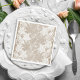 En rustisk land-bondgård, stil, pappra blöjor med chic på beige faux burlap, med en vacker blommigt som mönstras på vitt snöre med gräns.