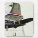 Vintage illustration affärsresor och transportdesign med arbetare eller anställda på byggnadsställningar som målar svansen på en stor jetlinjeflygplan på flygplatsen.