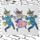 Tre söta dansande munchkins från Smaragdstaden som har kul. Pojkarna är klädda i blått och den flicka dansaren är klädd i en rosa klänning och de har alla roliga hattar!