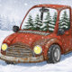 This design captures a nostalgic winter moment with a warm, rustic charm. At the center is an old-fashioned rusty red pickup truck, illustrated in a soft, painterly cartoon style. The truck has visible wear — patches of rust, softened edges, and a slightly weathered body — giving it that beloved vintage‑country character.