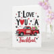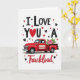 This greeting card features a vintage-style red pickup truck shown in profile, its glossy crimson body standing out against a plain white background. Above the truck, the phrase “I LOVE YOU A” sits centered in black letters dotted with tiny white spots, giving the line a sweet, cozy look 🥰. The “O” in “YOU” is replaced by a stitched-looking red heart, drawing the eye like a little promise between two people ❤️. In the truck bed, a soft pink rose rests with green leaves, adding a gentle touch beside all the strong reds and dark lettering. Below the truck, the word “Truckload” appears in rich red cursive, stretching across the lower area like it’s rolling along with the wheels. Small hearts in crimson and dark gray are sprinkled around the scene like confetti, making the space feel lively without being crowded. The truck’s black tires and simple window details keep the focus on the rose and the heart-shaped “O.”