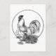 Snyggt, invecklad vintage tupp som härstammar från 1800-talet, med en svart och vit fågel som står på häckar och småstarna med två mindre kycklingar i bakgrunden. Rensad för att dekorera alla objekt på ett modernt och snyggt sätt. Lägg till din egen text till den här vackra nyheten om du vill eller bara njuter av den detaljerade svarta och vita Victorianska konsten.