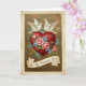 This design shows a large deep red heart with a soft, velvety look, set against a brown-and-gold background that looks aged with faint cracks. Two white doves sit on top of the heart, wings slightly open, facing each other with calm, tender expressions. Pink roses and small blue forget-me-nots cluster along one side of the heart, adding a gentle, romantic garden feel. A gold Cupid’s arrow runs through the heart, with tiny gold spark marks near where it enters, hinting at love that hits all at once. Near the bottom, a cream banner curls across the card and reads “To My Dearest Love” in dark, classic lettering. An ornate raised border frames the whole scene, giving it an old-fashioned look without feeling distant. It feels meaningful to give because the doves, flowers, and message all point to steady love and lasting care 🥰❤️.