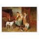 Vintagekonstverk av Adolf Eberle presenterar en lantlig plats i en ladugård var en mor sitter i en stol med henne bebiset på henne varven som introducerar bebiset till en kull av valpar. En valp är i mamma varv tillsammans med bebiset. Två äldre barn närliggande och morhundstativen håller ögonen på tyst och tålmodigt, som hon valpar påverkar varandra med deras människafamilj. Två hästar i ladugården håller ögonen på också. Den tyska konstnären, Adolf Eberle (1843-1914) var bördiga Munich. Hans far, Robert Eberle, var också en målare. Adolf var mest allmänning och favorit- subjekt familjelivplatser, inklusive huntsmen och bönder, från bayerskt och Tyrolean bondaktigt liv. Många av dessa för platser inklusive älsklings- djur också. Detta kort är tom insida för ditt egna meddelande.
