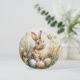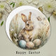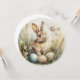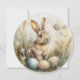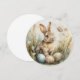 En vacker och mjuk akvarellmålning av en vårängskanin som sitter bland vilda gräs, ömtåliga tusenskönor och pastellfärgade påskägg. De mjuka färgerna och botaniska detaljerna ger detta konstverk en varm, vintage charm som perfekt fångar känslan av tidig vår.
