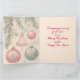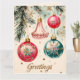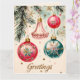 I detta julkort visas fyra vackert detaljerade prydnadsföremål som hänger från festive evergreen grenar. Bland prydnadsämnena finns en dekoration med rosa och klockform, en skarp rosa runt ornament, en tealblåsdekoration och en annan rosa med blommönstren guld och silver. Omgivande prydnadsföremål glittrar guld stjärnor och snöflingor, vilket ger en gnistrande, magisk beröring till designen. "Hälsning" i ord är skrivet i elegant, gyllene skript vid grund, vilket förbättrar kortets traditionella tema helgdag. Bakgrunden har en mjuk, vintrig känsla med snö-liknande accents, som fångar julsäsongens glädje och skönhet.