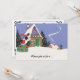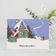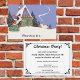 Lätt att anpassa julfestinbjudan. Vintage illustration Viktorian God jul helgdag med ett par av finare klädda i elegant och med en omsluten gåva eller present. De går genom snö för att närvara vid en jul party i ett hus i byn. Mannen bär en tuxedo och top hat och kvinnan bär varma kläder och har en päls muff. Träd omger bostadshus i snö och rök kommer från en skorsten i avstånd.