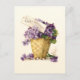 Nostalgiskt antika hälsningskort med text som visar att basket överflödar med violett och kort med Påsk Hälsning i guld-skript.