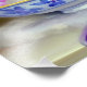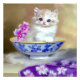 Fotoutskrift med en flytande vit kattunge! Den blåögda kattungen sitter i en blå skål med rosa blommor. En lila flödad filt är inkapslad framför. En fantastisk gåva till kattälskare och Viktorianska konstentusiaster!