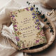 Omge firande med naturens skönhet i blomning. Den här designen har ett botaniskt gräns av färgstarka vilda blommor i lila, blått, gult och mjuk rosa, som ställs in mot en varm bakgrund av vintagen. Romantisk och tidlös, det är idealiskt för bröllop, vår eller sommarceremonier och trädgårdsininspirerat firande. Fullständigt anpassade med dina personuppgifter för ett unikt nyckelord.