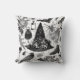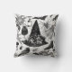 En vintage svart och vit Halloween-häxa mönster med en häxhatt, broom, skor, pigment, spindlar och annan Halloween ephemera. Roligt svart och vit vintage ephemera Halloween dekorativ kudde. Designad av Blackberry Boulevard.
