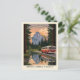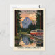 Buss kör en vintage röd tur längs en väg som reflekterar i en lugn, med ett stort berg och träd i bakgrunden.