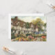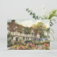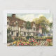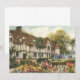 Vintageillustration arkitektonisk bild med en klassisk engelsk lanthestad eller herrgård med halmtak och vacker engelsk formell trädgård med blommande blommor på våren. Kan vara ett vackert lanthotell.