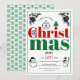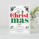 Vintage jul element typografi julfest inbjudan. Denna festliga design visar ordet "jul" i två delar i röd och grön fet typografi och flera element: snöflinga, julgransprydnad, tomte, snöman, tallgrenar med kottar och ett träd. Det finns också en grön kant runt omkring. Baksidan har ett mönster av gröna snöflingor på vit bakgrund.