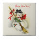 För sötsak en snögubbe lite och att ha på sig gröna mittens och en svart hatt, är hållande en gul sugrörkvast med ett rött band. Hälsning: Gott nytt år! Avbilda av vintagehälsningkort på en beställnings- färgbakgrund.