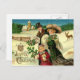Denna är en ursnygg vintagejulvykort av en elegantly klädd ung familj på deras långt som kyrktar. Fadern är i ett svart lag med brun päls och ha på sig en smart högväxt hatt. Modern är iklädd ett grönt lag och en stor hatt med fjädrar. Båda bär järnekar. Den gulliga lite blonda flickan är iklätt rött och är hållande en bok i en räcker och bära en julgran i annan. I snön bak dem är renar, och kyrkan kan ses i avståndet. Vykortet läser: "Joyous jul". Denna är riktigt en härlig familjjulvykort.