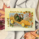 Den nyckfulla Victorianillustrationen som presenterar en dapper kalkon, kopplar ihop att ta ett drev i landet i en bil som göras av en majcob med skivade citroner för hjul. Förgrund som dekoreras med nedgånglövverk.