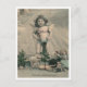 Unik antikisk reproduktion av vykort från 1907 med Froliche Weihnachten och en underhållande studio av ett barn i ängel vingar bakom en grupp leksak.