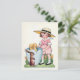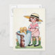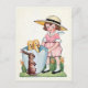 Vintage Påsk-kort som visar en liten flicka med ett knäckägg och två ankungar inuti. En Påskhare övervakar förfarandet. Kortmeddelandet är "Glad påsk".