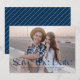 Enkla och moderna spara datum meddelande-kort med fullt-utfallsbilder på framsidan. "Spara datumet" visas i ett modernt teckensnittsöverlägg för marin vintage. Anpassa framsidan av det moderna fotot spara datumkortet genom att lägga till namn, bröllop datum och bröllop. En vit övertoning (tillval) finns för att göra texten tydlig. Datumkortets minimalistskydd återgår till visningen med ett tunt, vitt diagonalt rand med en marin bakgrund eller färg efter eget val.