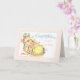 En söt baby som lägger sig i en krubb omgiven av blommor och en söt liten bunny. Vintage bild har helt återställt den vackra matchningen med en söt ljus rosa och vit polka dots mönster i bakgrunden. Skrivna "Grattisar" i blått, finare-teckensnitt.