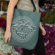 Festive helgdag tote bag har en logotyp från vintagen för Guld Exotic Spices, Specializing in Frankincense and Myrrh, i en cirkelformad bricka med trendig monoline block och skripttypografi. Spruce grönt färg är helgdag med vita bokstäver och svarta handtag.