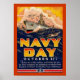 Vintage affisch firar den 27 oktober som marindagen. Poster har rött gräns, förstörare att skära genom vågar med flygplan-overhead, "Navy Day" i ord i gult till rött.