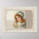 Viktorianskt barn med söt blomkhatt grönt. Söt ansikte och krämt smycka hår. Bakgrunden är en mjuk elfenbensdamm. Uppsättning med 12 vintagars underordnade illustrationer av Frances Brundage. En underbar vintage.