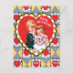 Förtjusande och färgrikt vintagevalentineskort. En ung pojke och flicka på centrerar omgivet av en design som göras upp av att växla, kvadrerar att innehålla hjärtor och trianglar av blått och guld