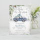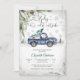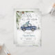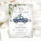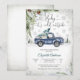 Fira med mysig stil med denna charmiga vinter-baby shower-inbjudan som visar en akvarellblå vintage-lastbil som bär på ett julgran och presenter. Snöflingor, tallgrenar och städsegröna träd skapar en festlig säsongsbakgrund, medan den eleganta "Baby it's cold outside"-skriften tillför en lekfull touch. Perfekt för vinterfiranden, denna anpassningsbara design blandar rustik charm med julstämning, vilket gör den idealisk för att hedra blivande föräldrar under de kallare månaderna.