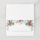 Denna vackra utformning av platskort har en vattenfärg gren med grönt och röda bär på en ljusvit bakgrund. Det finns utrymme för skriva i namn och bordsnummer. Baksidan/insidan har en röd gingham mönster.