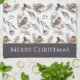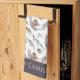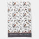 Här är en söt kökshandduk för använda under Julhelgen. I mönster ingår små vinterfåglar i rött och blått grått-toner, löv och bär från holly, och de placeras på vit bakgrund. I ena änden matchar du grått gräns med anpassningsbarnas text i vitt. Elegant och festlighet!