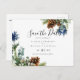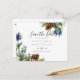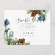 Vackra eukalyptusblad, blå tistelblommor, salvia grön lövverk, tallkottar ingår i dessa vinterbröllopsartiklar. En del av en större samling som inkluderar bröllopsinbjudningar till budgetpris, spara datum-kort, RSVP-kort, tack-fotokort, bröllopspresenter till brud och brölloppsfest, med mera. För en detaljerad GRATIS guide för vinterbröllopsplanering, besök weddingdesignchic.com.