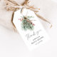 Minimalistisk rustik vinterflora tacktagg med en akvarellblomsterarrangemang av tallbarr, röda bär och eukalyptusgrönska. Med elegant handskriven kalligrafi.