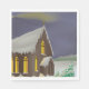 En vinterkyrka täckt i snö. Den här designen ser ut att vara effektiv på dessa Pappra servetter