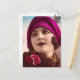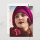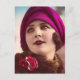 Färgfotografi av en vacker ung vintage dam i päls och fuschia-hatt. Mörk röd läppstift och röd blomma på hennes halsband.