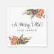 Papper napkin med vattenfärgad illustration av botaniska vintern, inklusive mistletoe, gräs träd gren, bär, orange osv. I texten står det: "En fin liten babydusch." Genusneutral utformning.