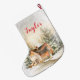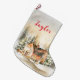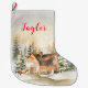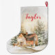 Denna vackra och festliga vattenfärgstrumpning kan vara personlig med ett namn. Den har en rustik vinterstuga omgiven av snö och träd. Det finns goda djur, som en älg och en husky-hund, och även löv. Det här är perfekt till jul.