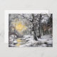 Snötäckt vinter skogs målning fångar en solnedgång ögonblick med en vatten källa korsar den vita marken, ett hus och en hjort gömmer sig bakom ett träd.