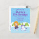 En söt rödhårig flicka i en mörkgrå kappa, lila handskar, en scarf och skridskor som åker på en isbana bredvid en bedårande enhörning med lila och grön man och svans. I bakgrunden finns snötäckta träd, snötäckta kullar och en klar blå himmel med fallande snö.
