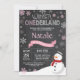 Vinter Onederland Snöman 1-års inbjudan. Babyflicka. Rosa och vit snöflinga. Första födelsedagen. Flickas 1-års födelsedagsinbjudan. Svartvit skrivtavla bakgrund. För ytterligare anpassning, klicka på "Anpassa"-knappen och använd vårt designverktyg för att ändra denna mall.