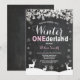 Vinter Onederland Födelsedagsinbjudan. Första födelsedagen. Flickas 1-års födelsedagsinbjudan. Kritskriftsbakgrund. Svart och vit. För ytterligare anpassning, klicka på "Anpassa"-knappen och använd vårt designverktyg för att ändra denna mall.