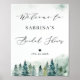 Välkomstskylt för bröllopsdusch med vinter skog tall.