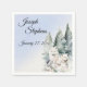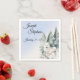 En lugn vinter vildlivsscen med två majestätiska vita vargar omgivna av snötäckta tallar, mjuk fallande snö, städsegrön lövverk och frostiga vintertexturer. Denna fridfulla arktiska skog design blandar vattenfärgskonst med naturinspirerade detaljer, perfekt för vinterfödelsedagar och vinterfester.