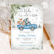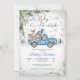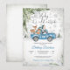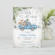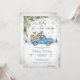 Fira en mysig vinter baby shower med denna charmiga inbjudan som visar en vintage blå lastbil som transporterar söta skogs djur omgivna av snöflingor, tallgrenar och festliga ballonger. Den snöiga skogsbakgrunden skapar en magisk säsongsatmosfär, perfekt för att hedra en blivande mamma. Eleganta teckensnitt och genomtänkt design gör denna inbjudan idealisk för vinterfiranden, och tillför värme och glädje till ditt speciella evenemang.